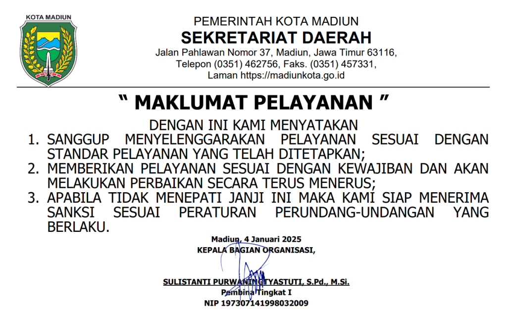 Informasi Maklumat Layanan Bagian Organisasi Sekretariat Daerah Kota Madiun