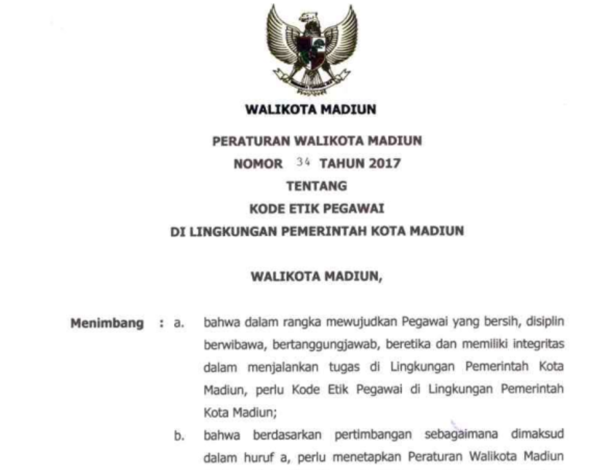 Peraturan Walikota Madiun Nomor 34 Tahun 2017 tentang Kode Etik Pegawai di Lingkungan Pemerintah Kota Madiun